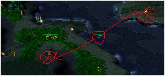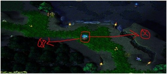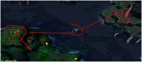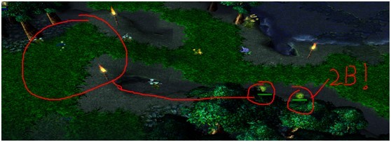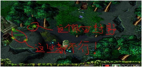 这里有两棵草,下面的一棵就是全地图唯一的封双野眼的位置(不要跟我说天灾也有封双野的点,我以我的ID担保,很负责任的跟您说,天灾不可能一眼封双野),上面那一棵草就是排眼插真眼的地方,真眼插这里这3个野点都不会封掉