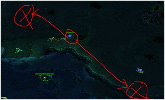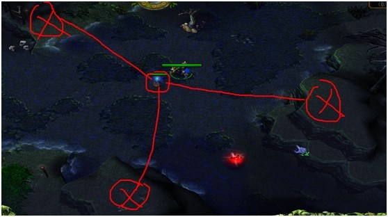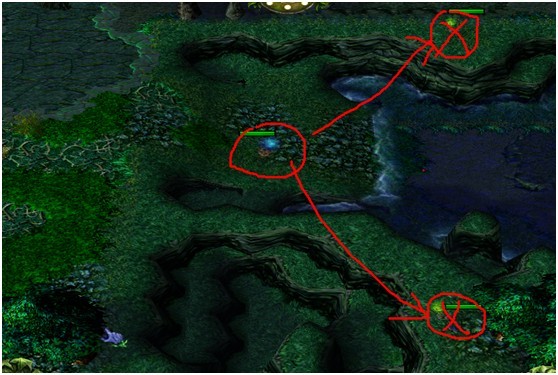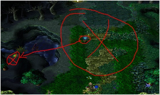 如图假眼的位置,这是个非常萎缩的封野眼,本人封这个野点基本都是插这里,无论你怎么站都看不到这个眼,只有拉鸟过来给视野或者吃2棵树进去,不然你是反不掉这个眼的,排封眼见真眼位置